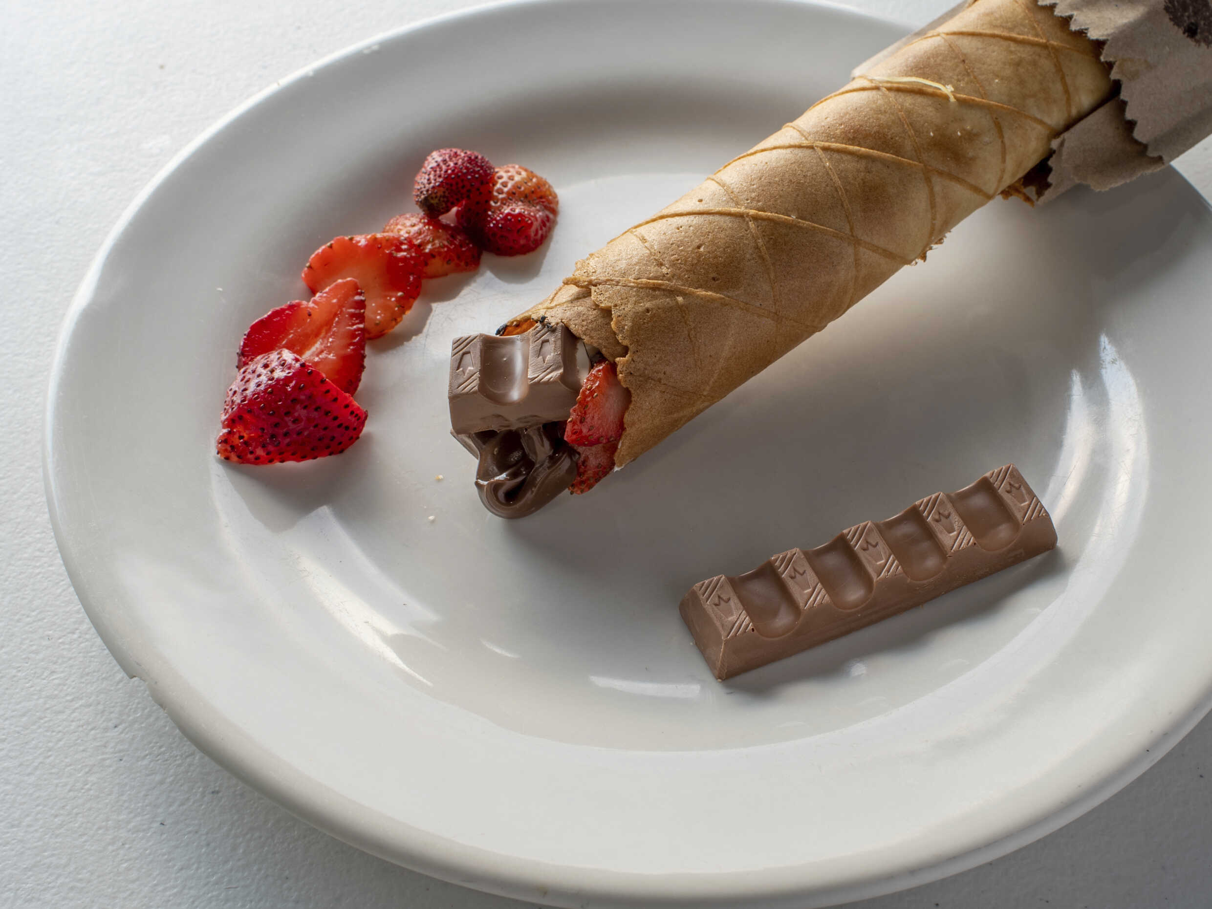 Marquesita crujiente rellena de Nutella, fresas y chocolates Kinder maxi. Una combinación que no puedes dejar de probar.
