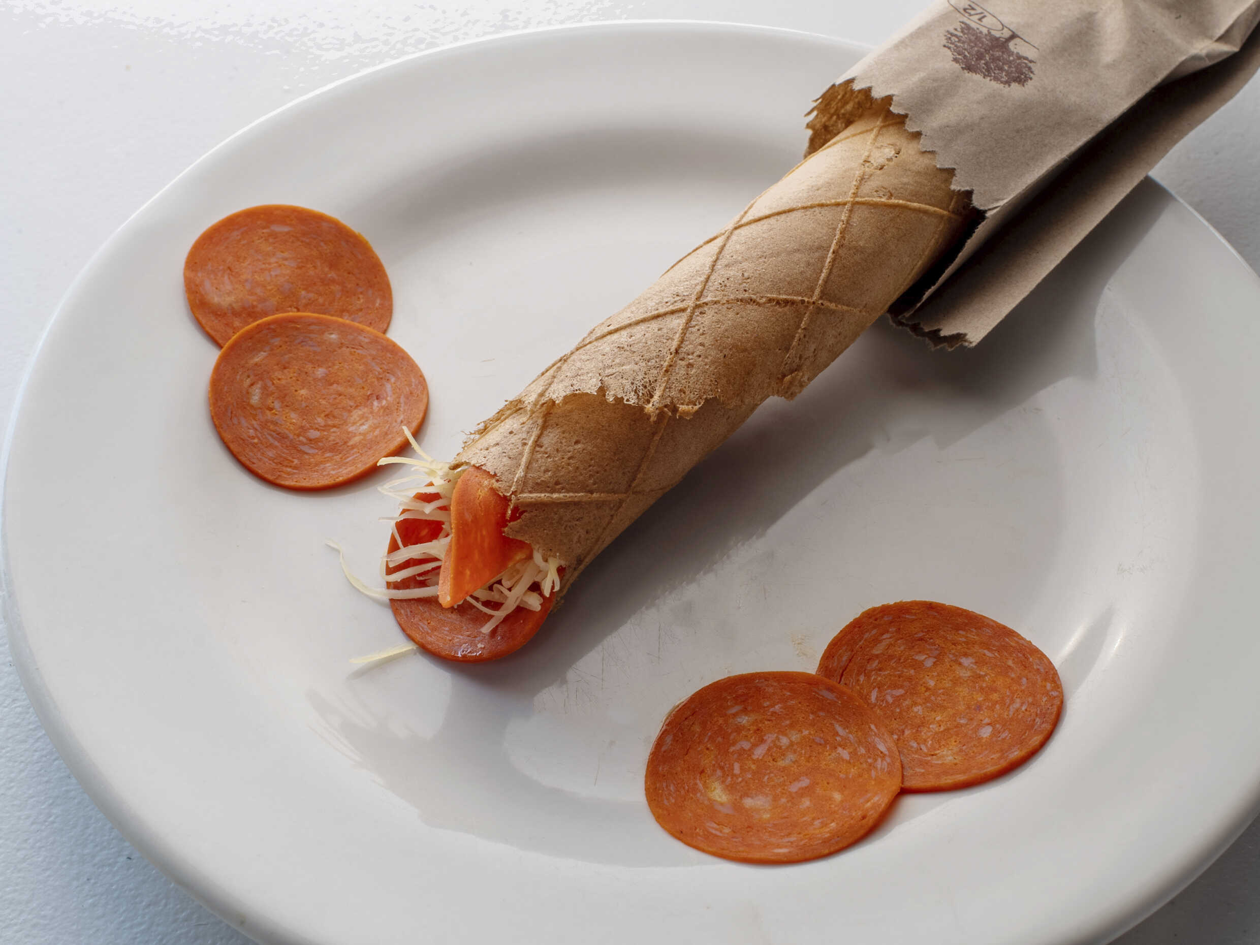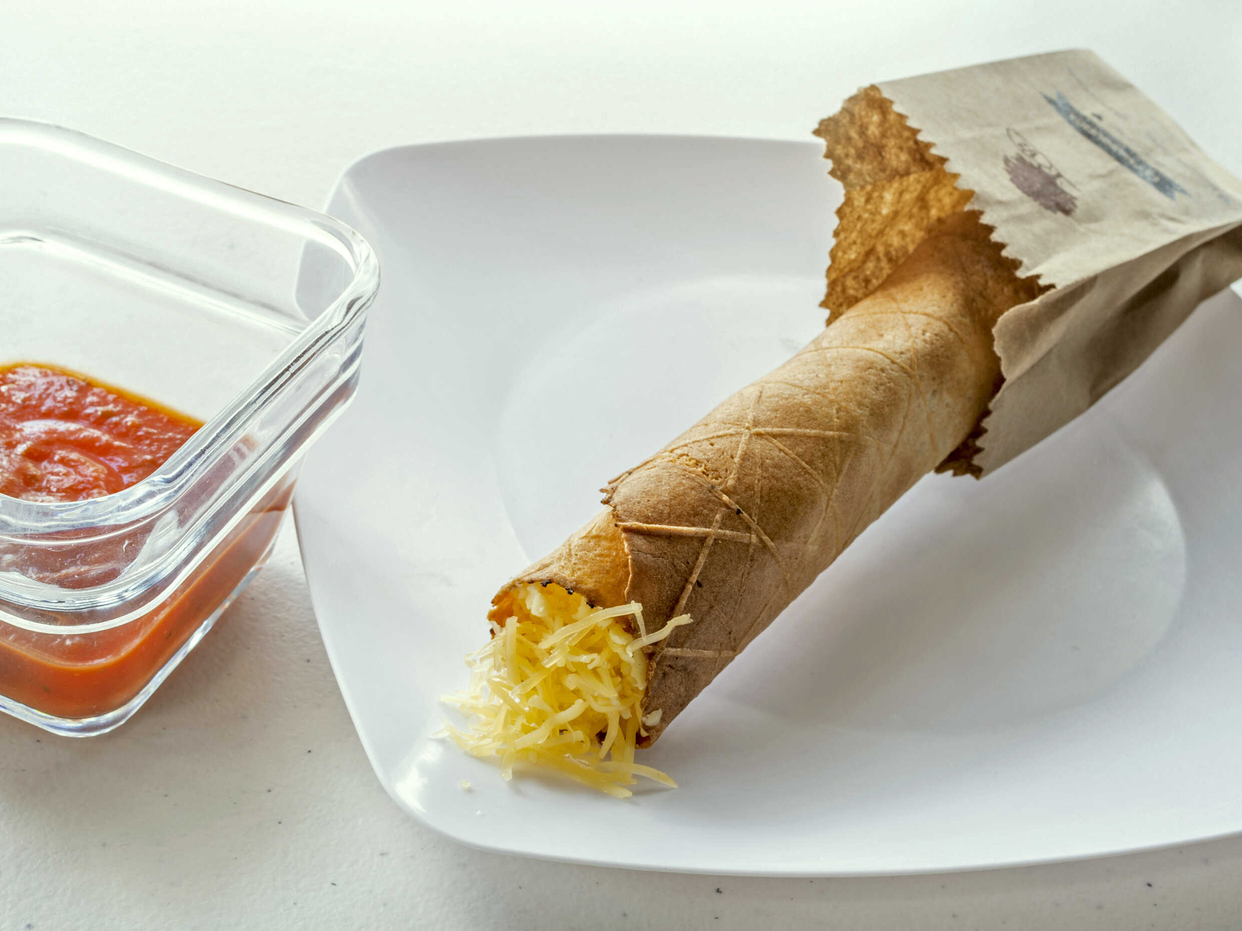 Marquesita crujiente rellena de queso holandés y pepperoni.