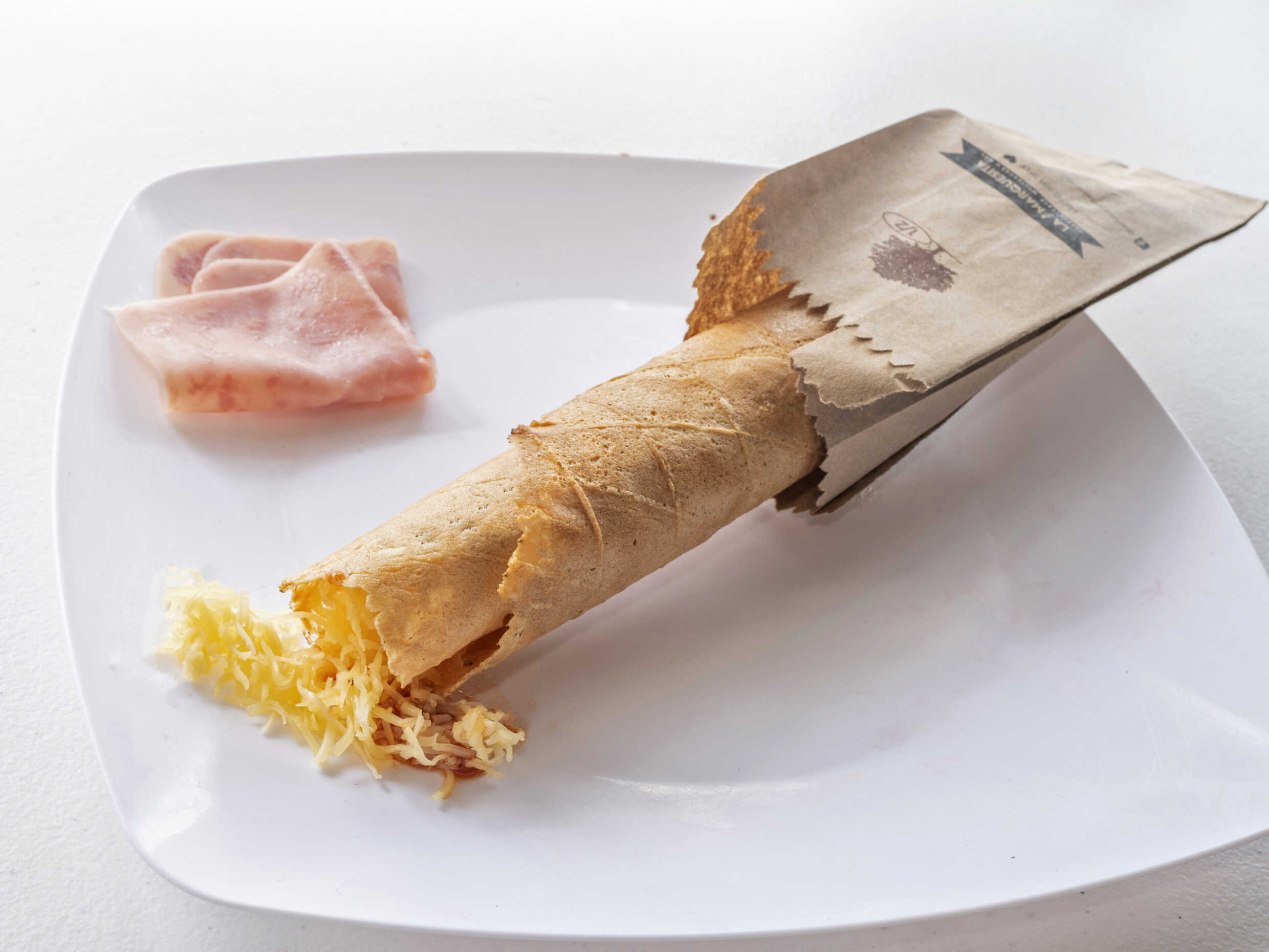 Marquesita crujiente rellena de queso holandés, queso Philadelphia y jamón. La consentida de las saladas.