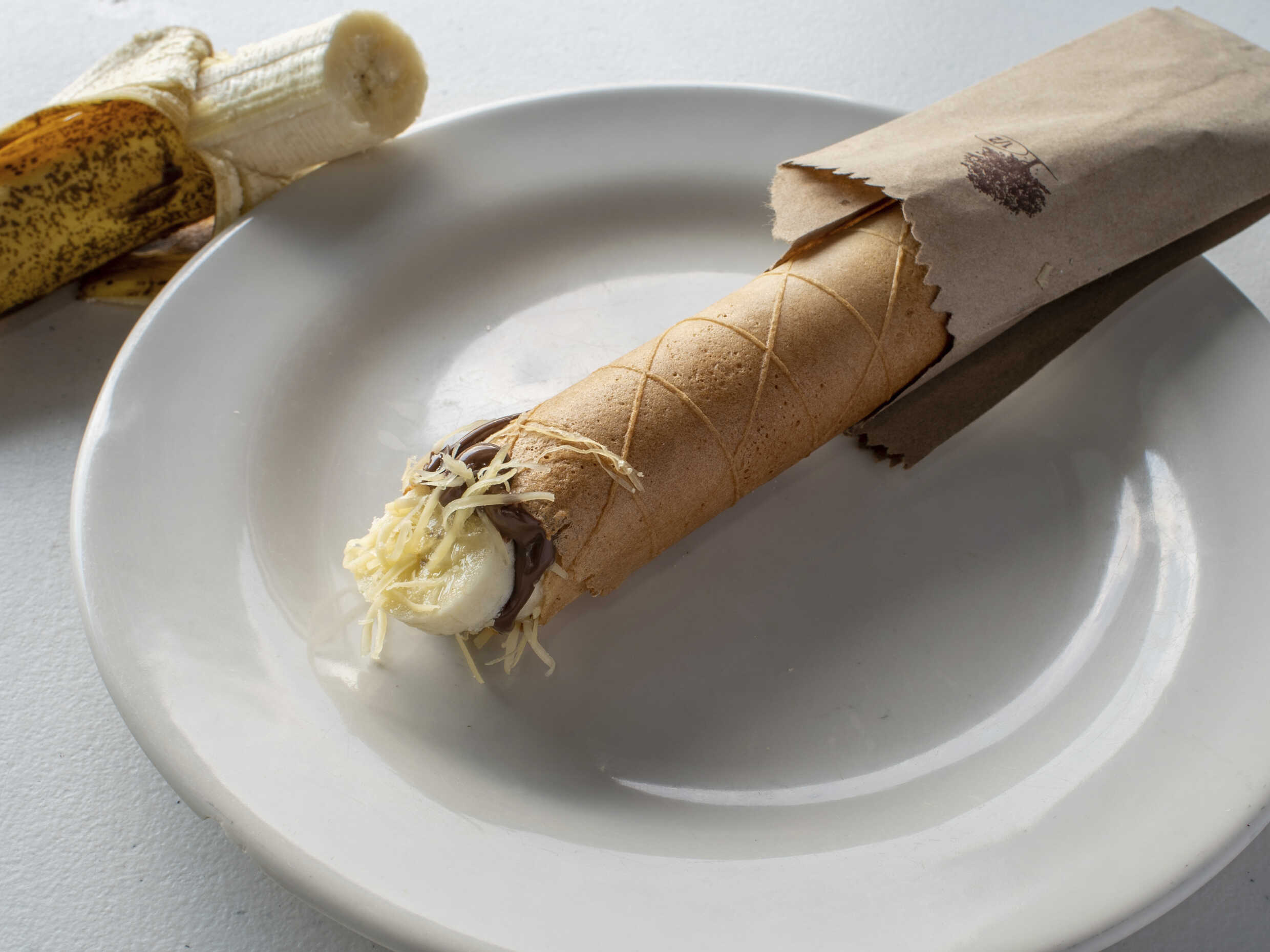 Marquesita crujiente rellena de queso holandés, cajeta y plátano.