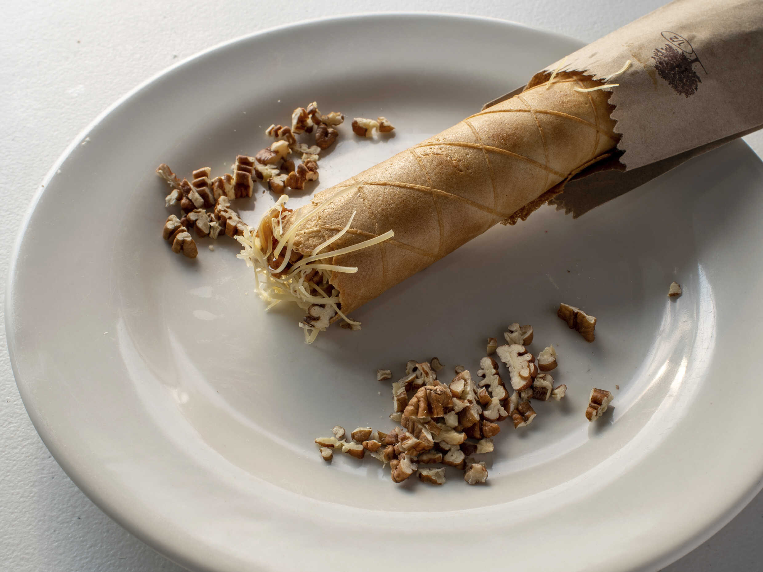 Marquesita crujiente rellena de queso holandés, cajeta y nuez, una combinación espectacular. Dentro de las favoritas.