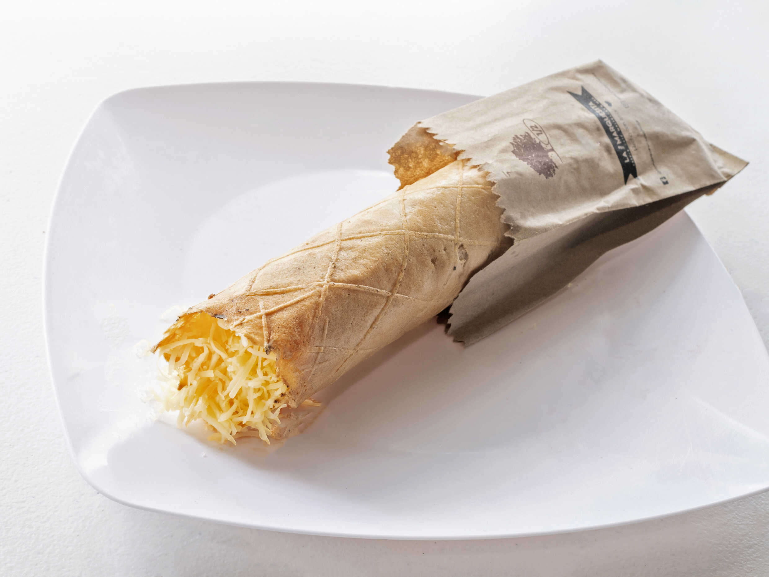 Marquesita crujiente rellena de queso holandés, queso Philadelphia y queso manchego. Está espectacular, tienes que probarla.