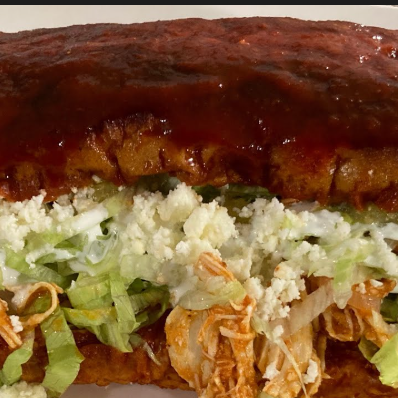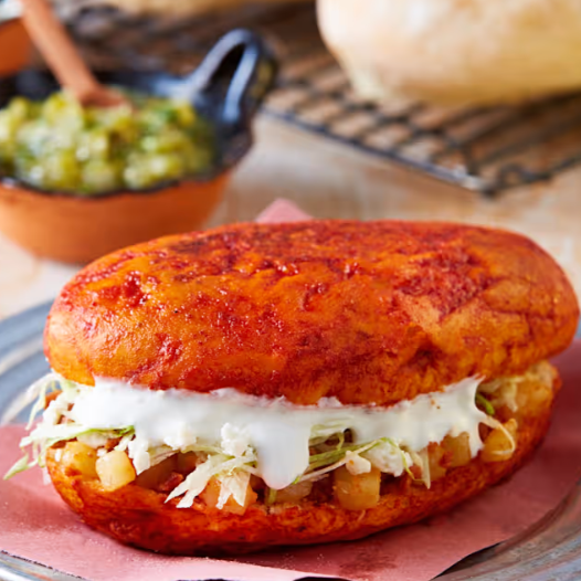 Pambazo Adobado lleva Papa y Chorizo, lLechuga, Crema y Queso Rayado
