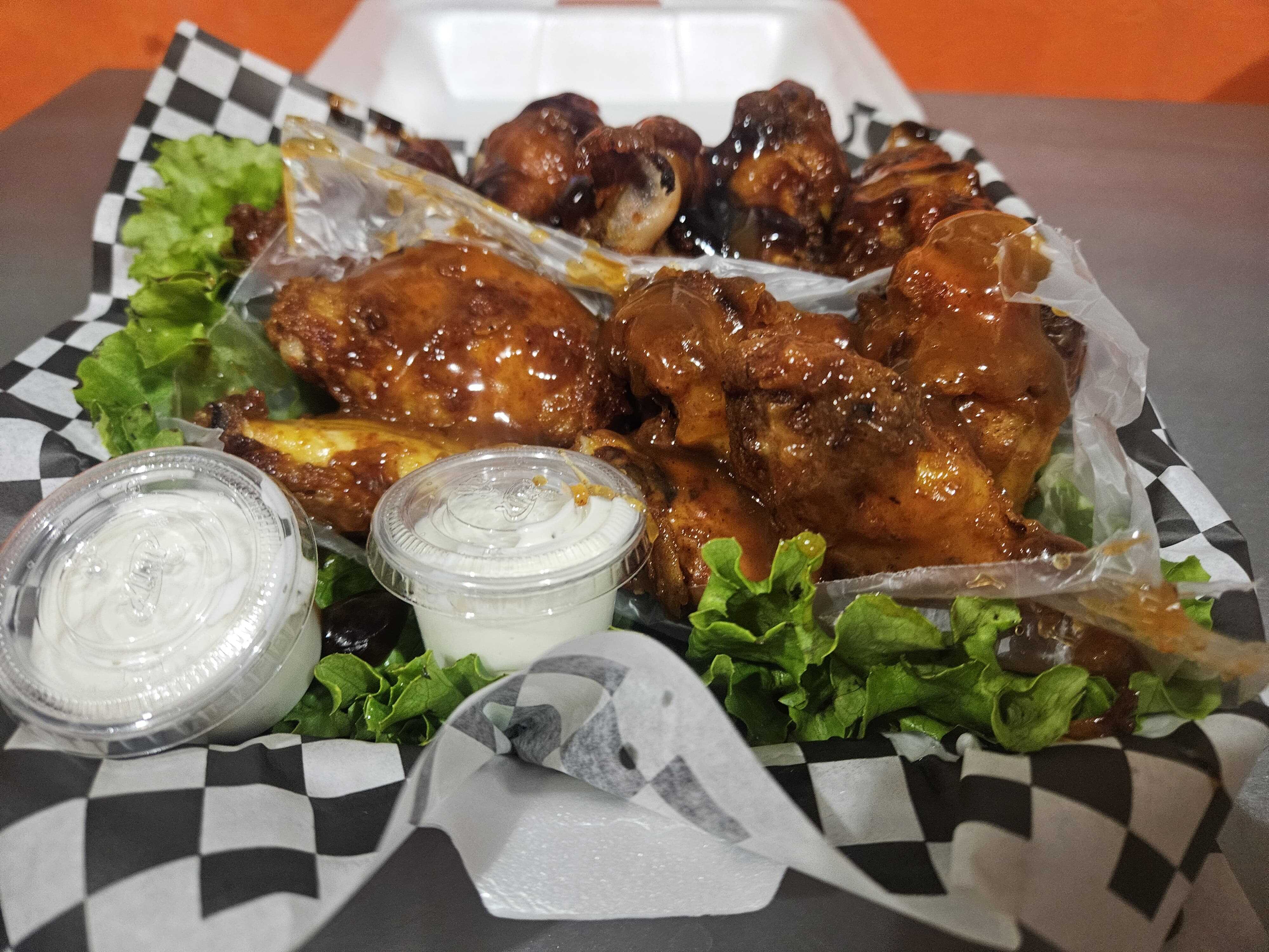 Orden de alitas bañadas con las salsa de tu preferencia, sobre una cama de lechuga Italiana, acompañadas de aderezo ranch