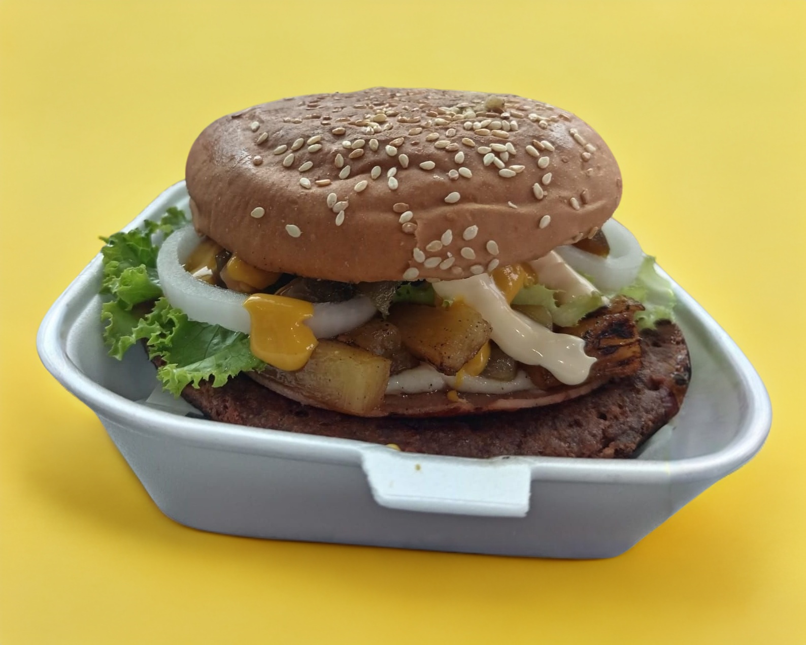 Pan, Carne, Jamon, Queso, Piña, Cebolla, Jalapeño, Lechuga ItalianaCatsup, Mostaza, Mayonesa