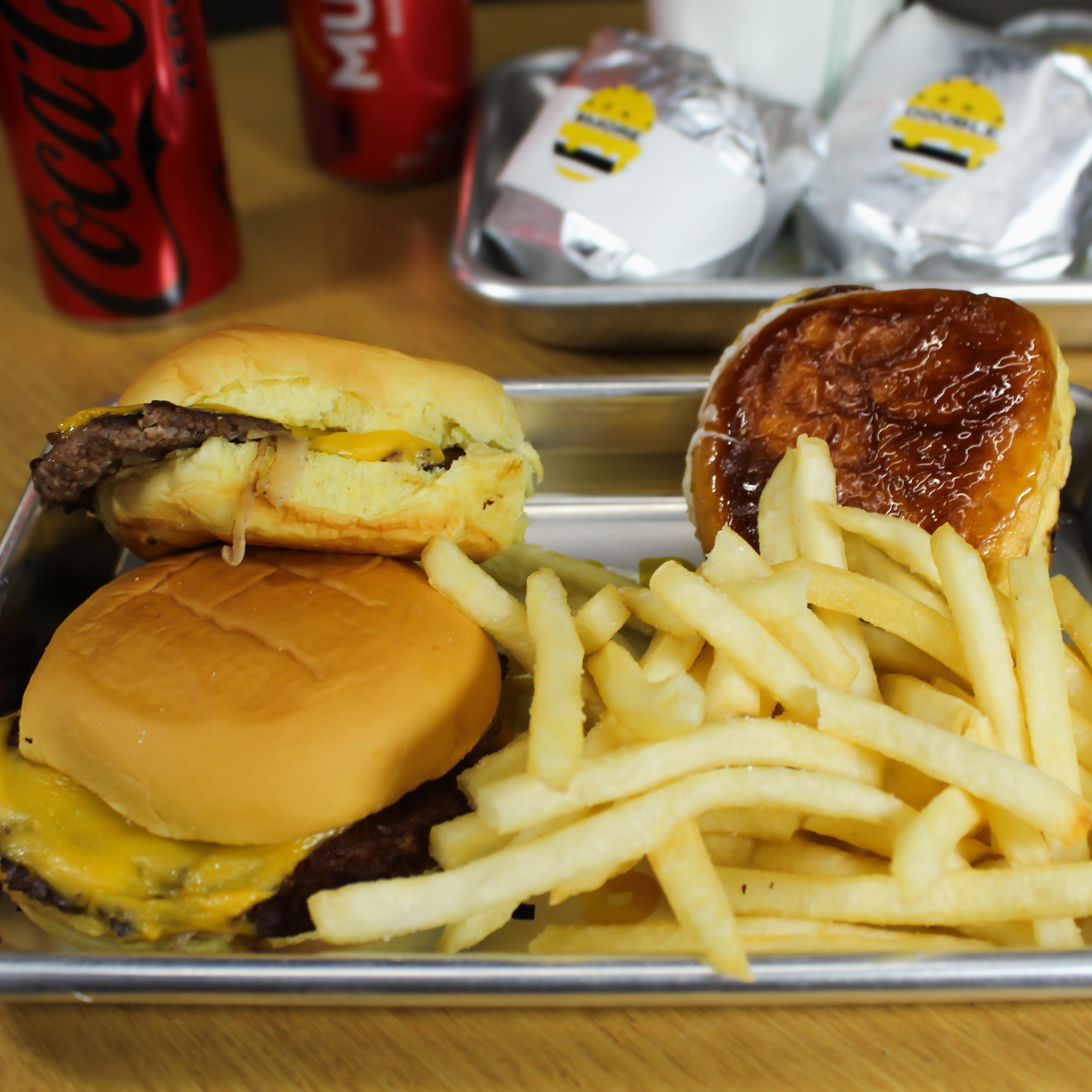 dos hamburguesas sencillas tipo slider + bebidas