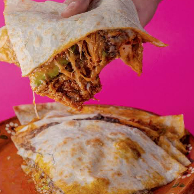 Tortilla de harina grande, frijoles refritos,aderezo de chipotle, queso manchego,queso oaxaca ELGE ENTE PIERNA, SUADERO O COCHINITA PIBIL.