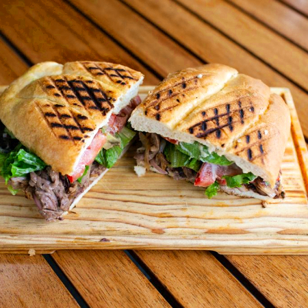 Jugosa arrachera a la parrilla, frijoles refritos, aderezo de chipotle, queso oaxaca, lechuga, jitomate y aguacate.