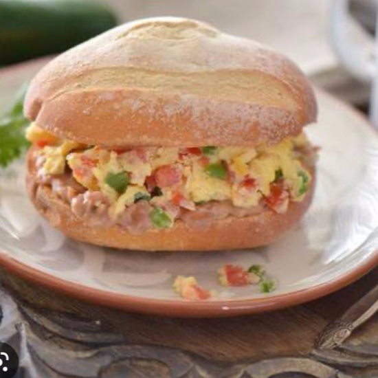 Frijoles refritos, huevo revuelto a la mexicana, queso oaxaca, jitomate,lechuga y aguacate.