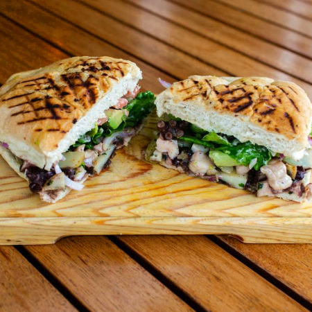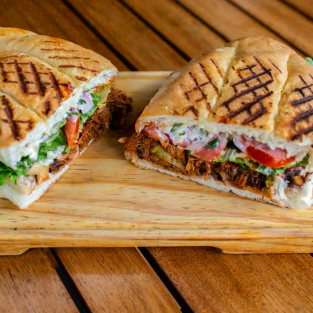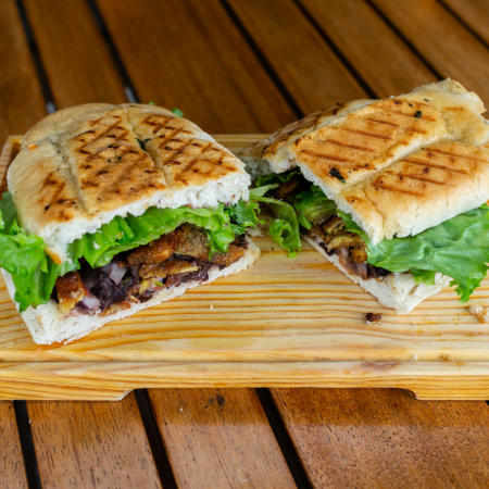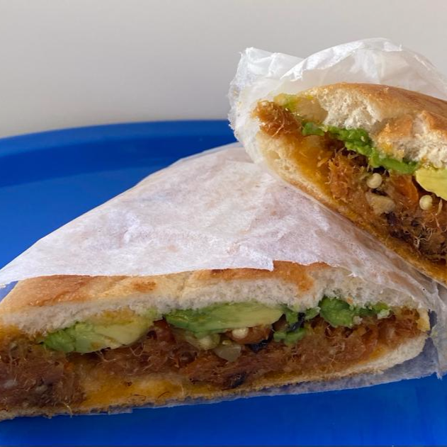pan artesano, aderezo de cilantro, frijol,pechuga de pollo a la plancha, queso manchrgo,lechuga, jitomate y aguacate