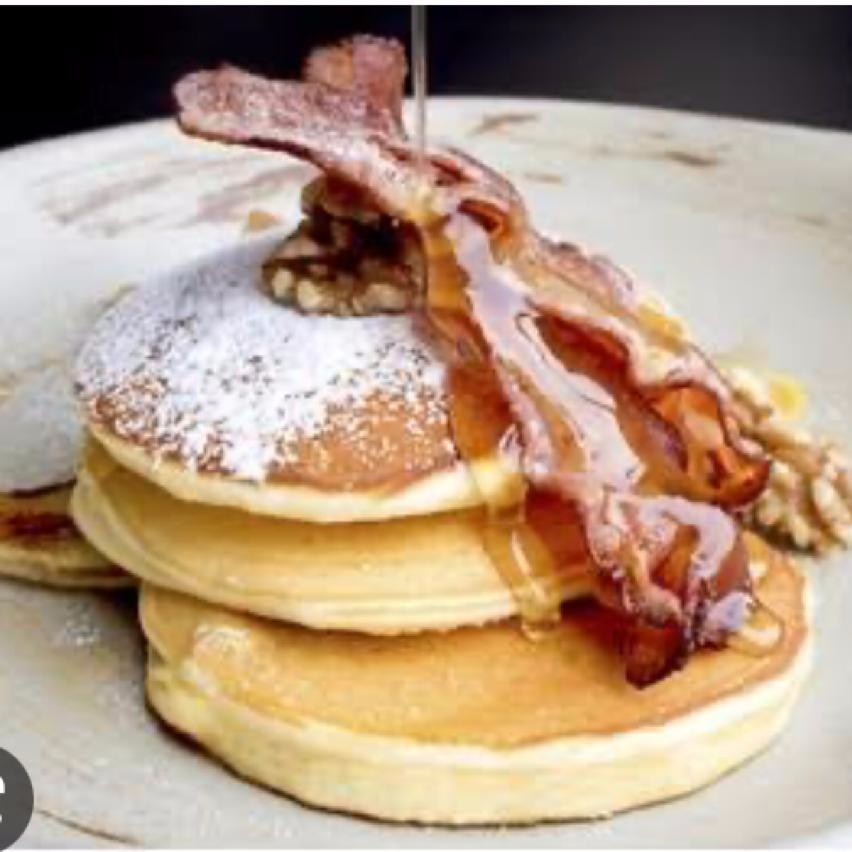 3 piezas, esponjosos acompañados con 2 tiras de tocino y miel de maple