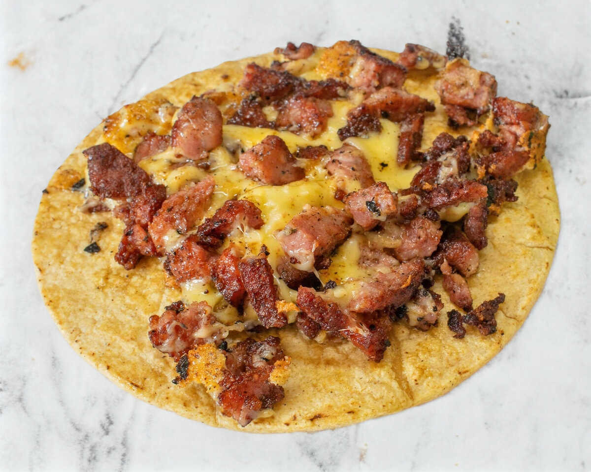 Pan pita, cochinita pibil, queso gouda, cebolla en escabeche y salsa de habanero aparte.