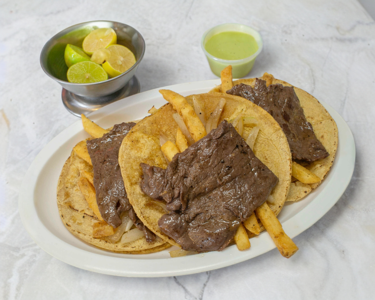 3 tacos con doble tortilla, cecina, longaniza ,papas la francesa y cebollita asada. (NO SE VENDE SIN CEBOLLA)