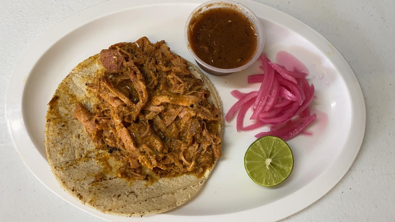 Tortilla de maíz, cochinita pibil, cebolla morada y salsa de habanero.