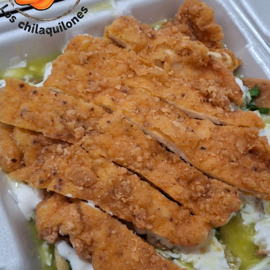 Pechuga empanizada, queso, crema, cebolla, cilantro y aguacate.