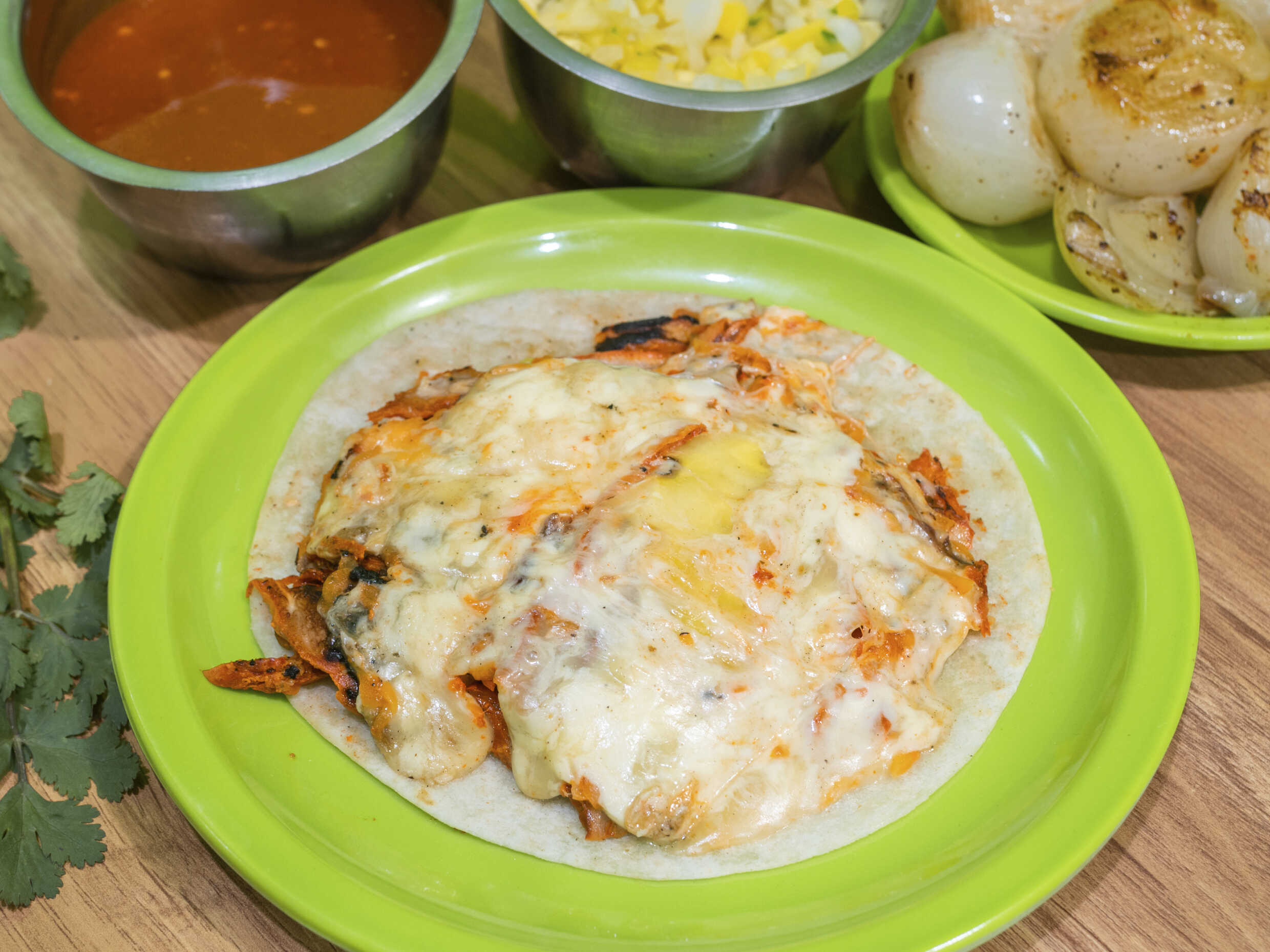 1 porcion personal de Quesadilla de Queso, tortilla es de harrina o maiz, queso manchego con gouda, complementos van aparte ( salsa cebolla y cilantro )