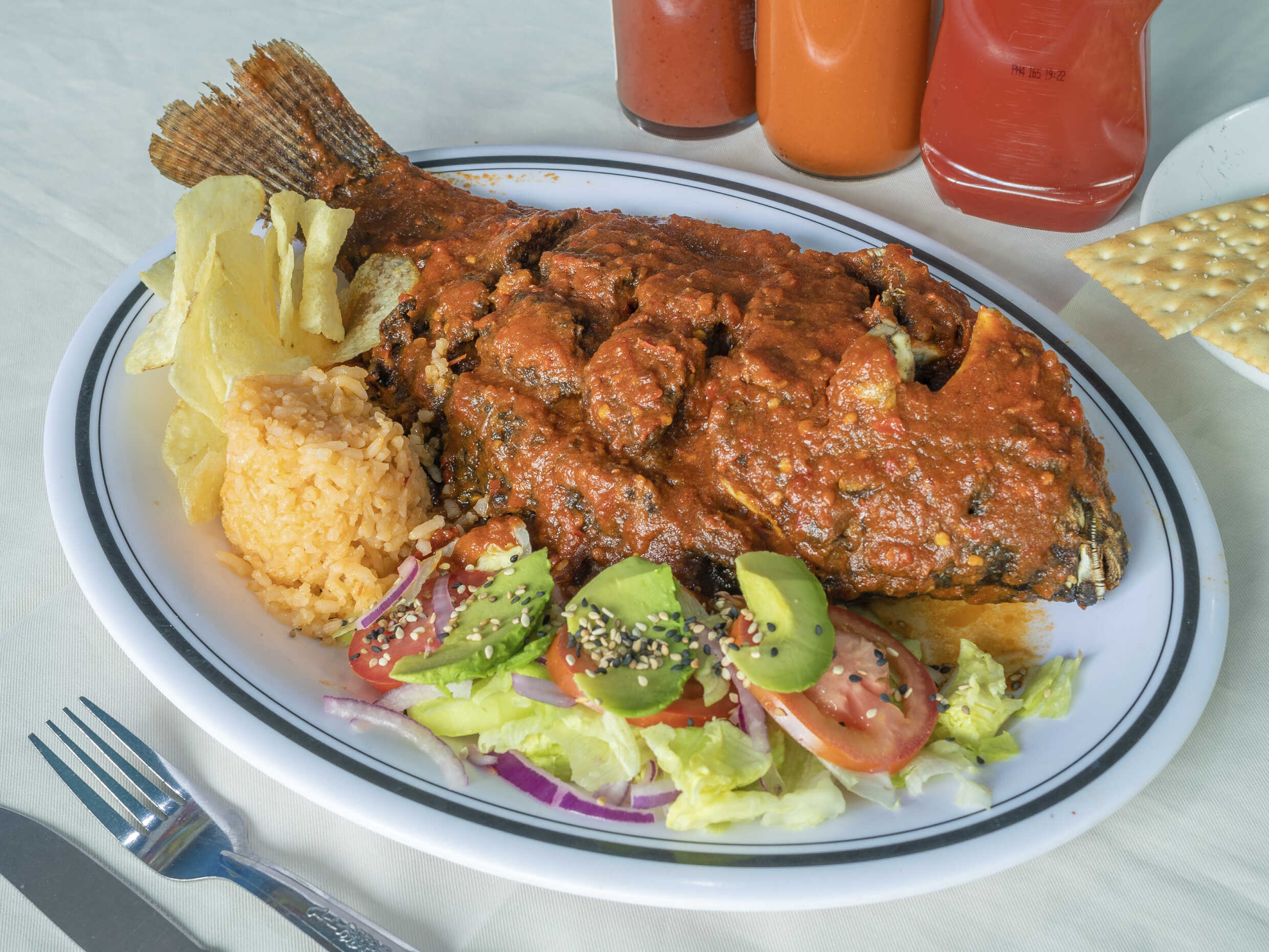 sabrosa mojarra de 1kg aprox. dorada y bañada en nuestra salsa a la diabla picosita, acompañada de ensalada y arroz