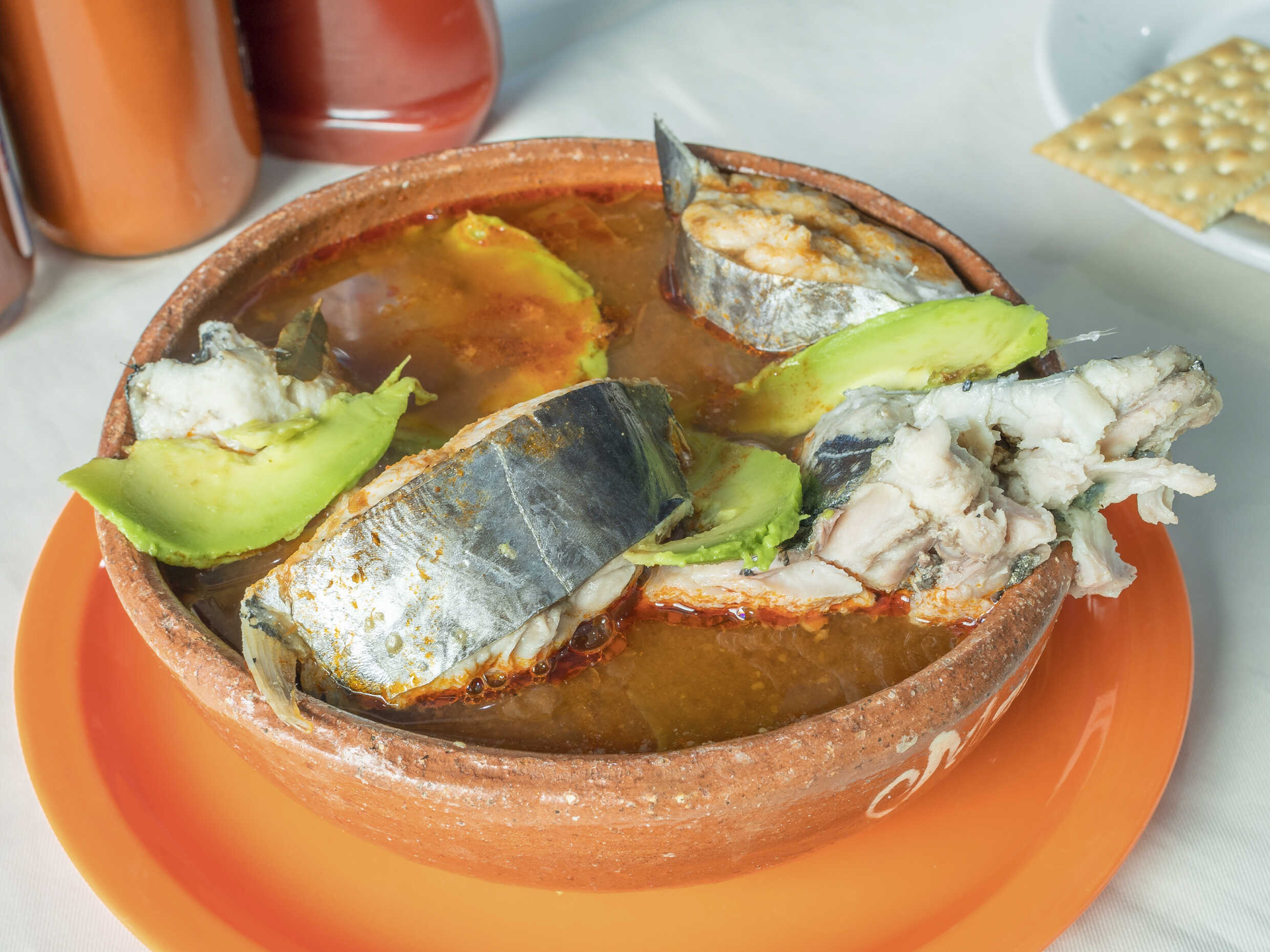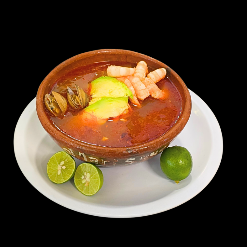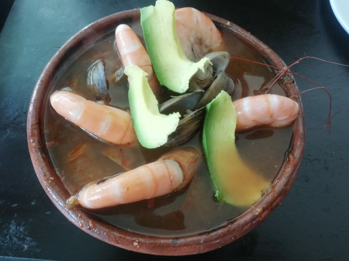 Nuestro tradicional caldo. Con sabroso pescado y almeja, limón y aguacate, un litro.