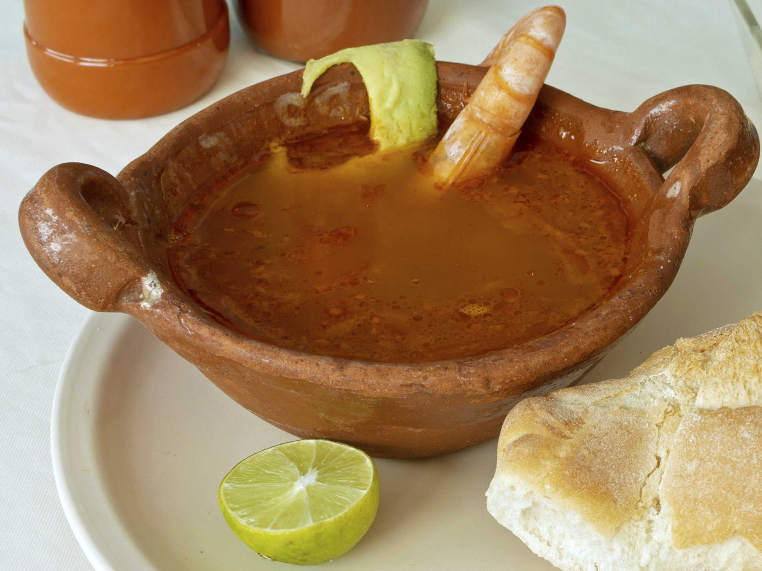 Nuestro tradicional caldo de Camarón y almeja, limón y aguacate, un litro.