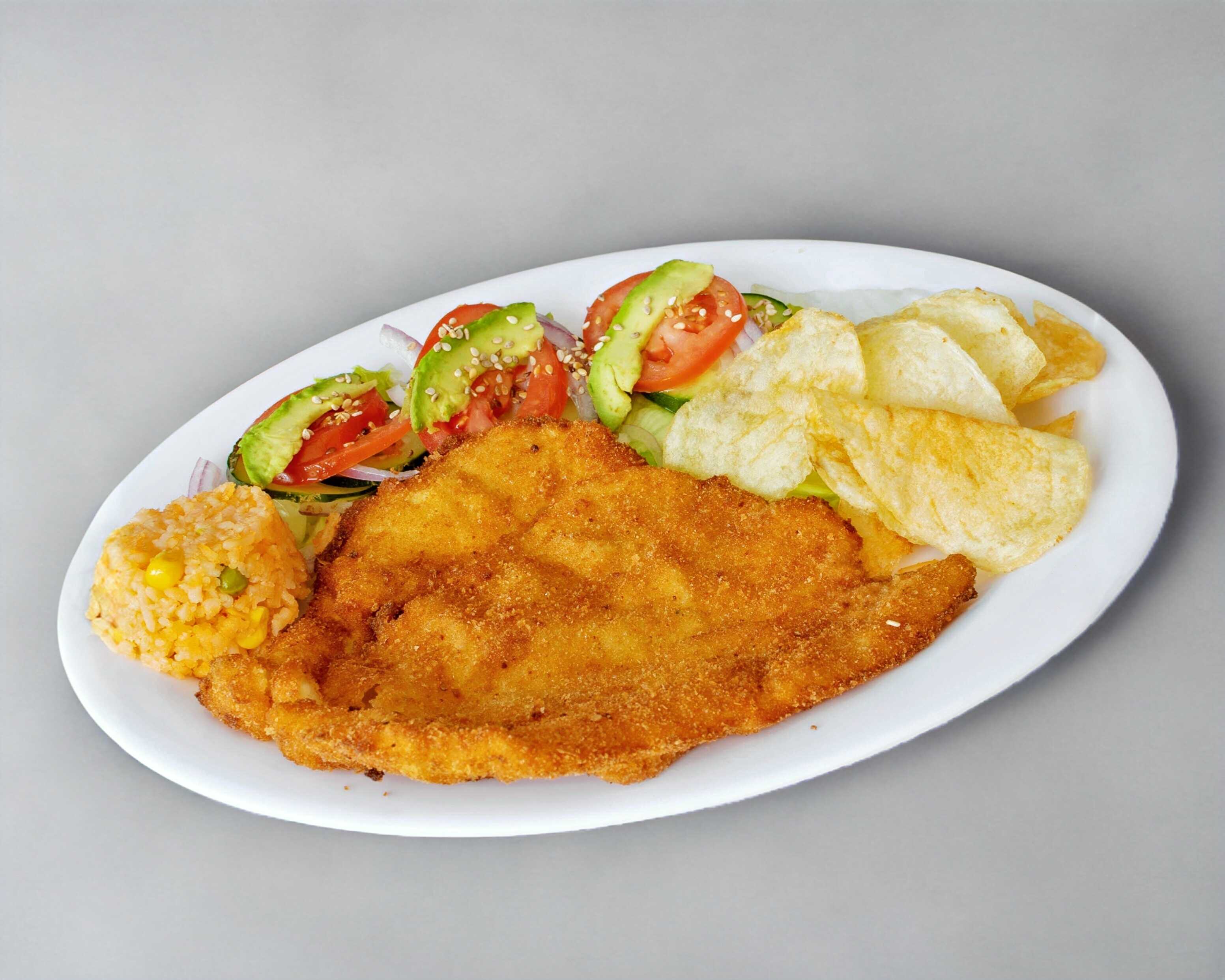 Sabroso filete frito bañado en nuestra salsa de la casa acompañadp de ensalada y arroz