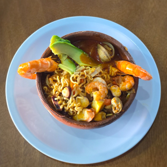 Nuestro tradicional caldo fusionado con pasta ramen, con una mezcla de camaron, pulpo, abulon, surimi, almeja y ostion 1lt
