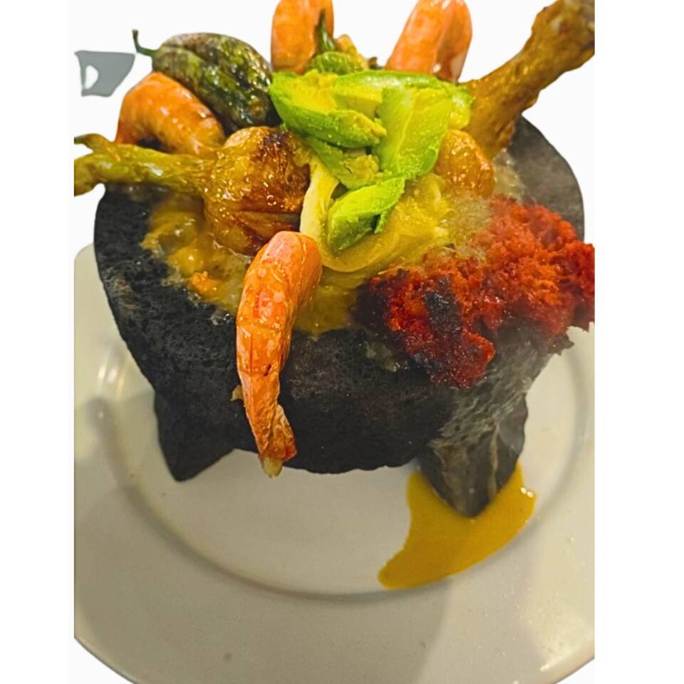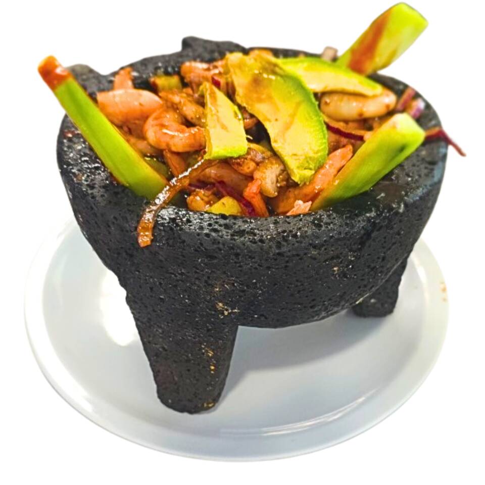 Preparado en un molcaje con chiltepin, salsas negras, limon, una mezcla de camaron, pilpo, abulon, surimi, pepino, cebolla morada y aguacate. Servido en un vase de 1lt