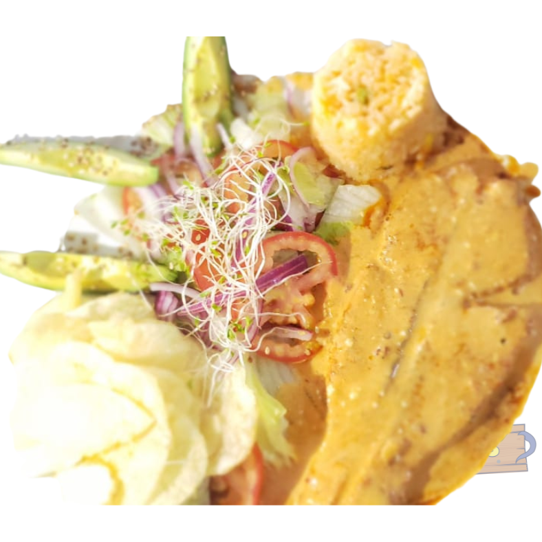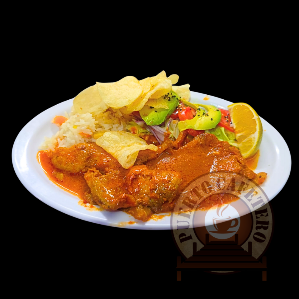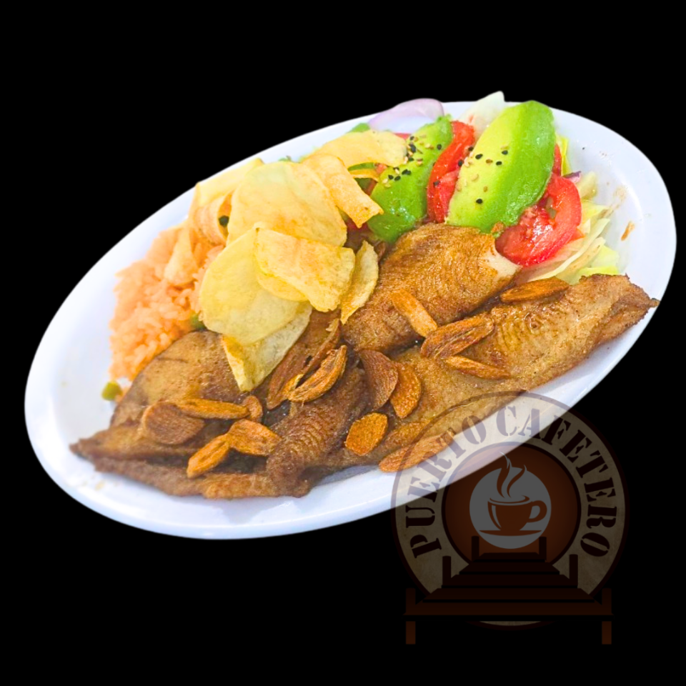 sabrosa mojarra de 1kg aprox. dorada y bañada en nuestra sabrosa salsa de la casa picosita, acompañada de ensalada y arroz