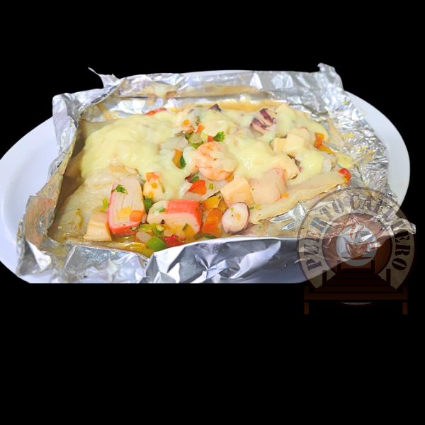 Filete cocido en aluminio relleno de camaron, abulon, surimi,pulpo, jitomate, cebolla y queso gratinado