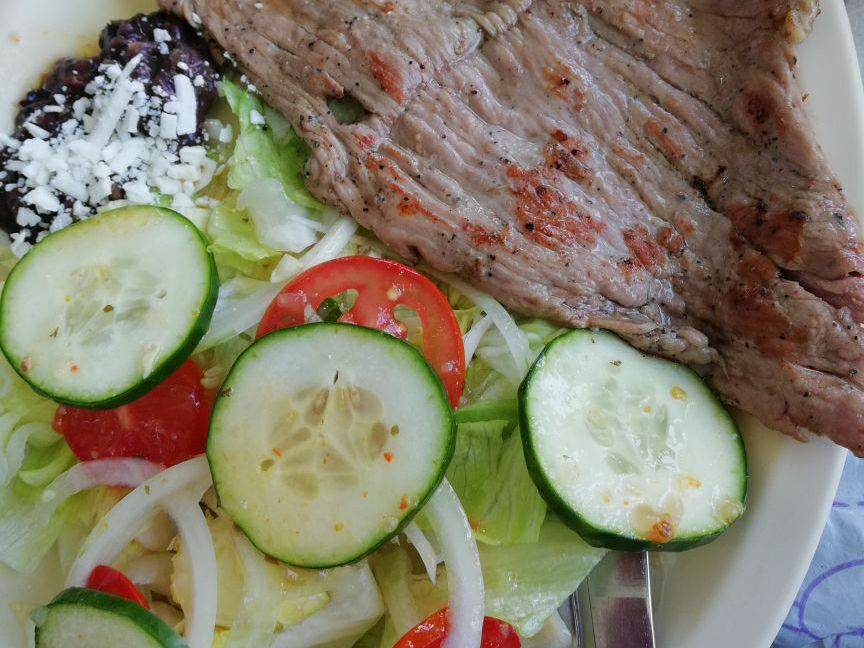 sabroso filete a la plancha zasonado y acompañado de ensalda y arroz