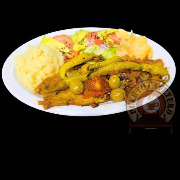 Filete preparado con mantequilla, chile guero, aceituna, jitomate, cebolla y sazonado con especies y epazote. acompañado de ensalada y arroz