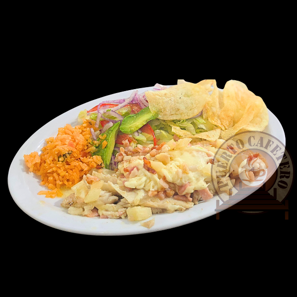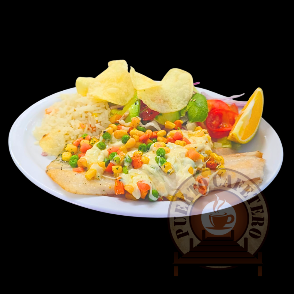 Sabroso filete preparado con chicharo, zanahoria, elote y queso gratinado acompañado de ensalada y arroz