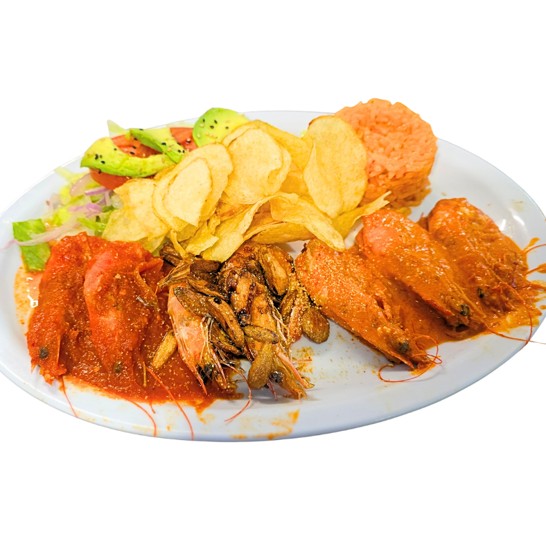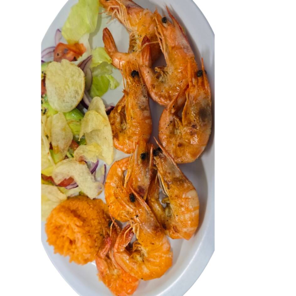 “Camarones salteados en nuestra sabrosa y tradicional salsa de la casa, servidos con ensalada fresca y arroz.