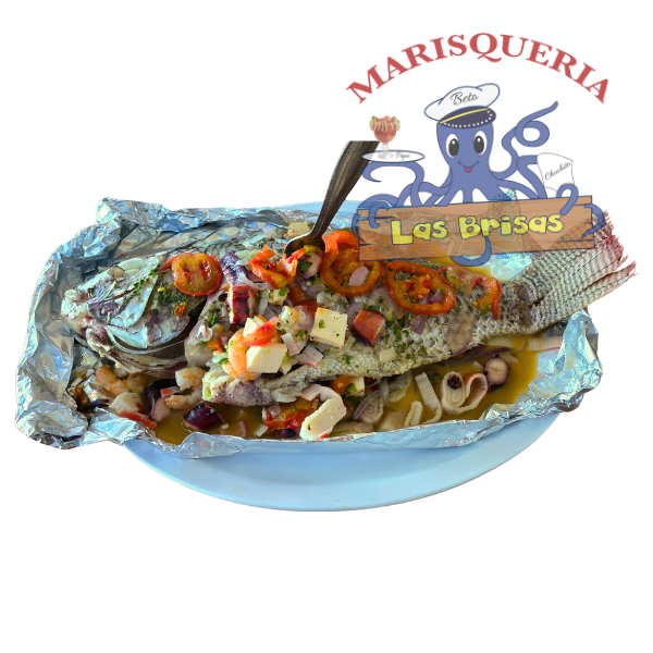 Mojarra de 1kg aprox, envuelta en papel aluminio rellena de camaron, pulpo, abulon, surimi,