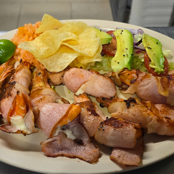sabroso camarones rellenos de queso philadelfia envuetos en tocino, guarnicio de ensalada y arroz