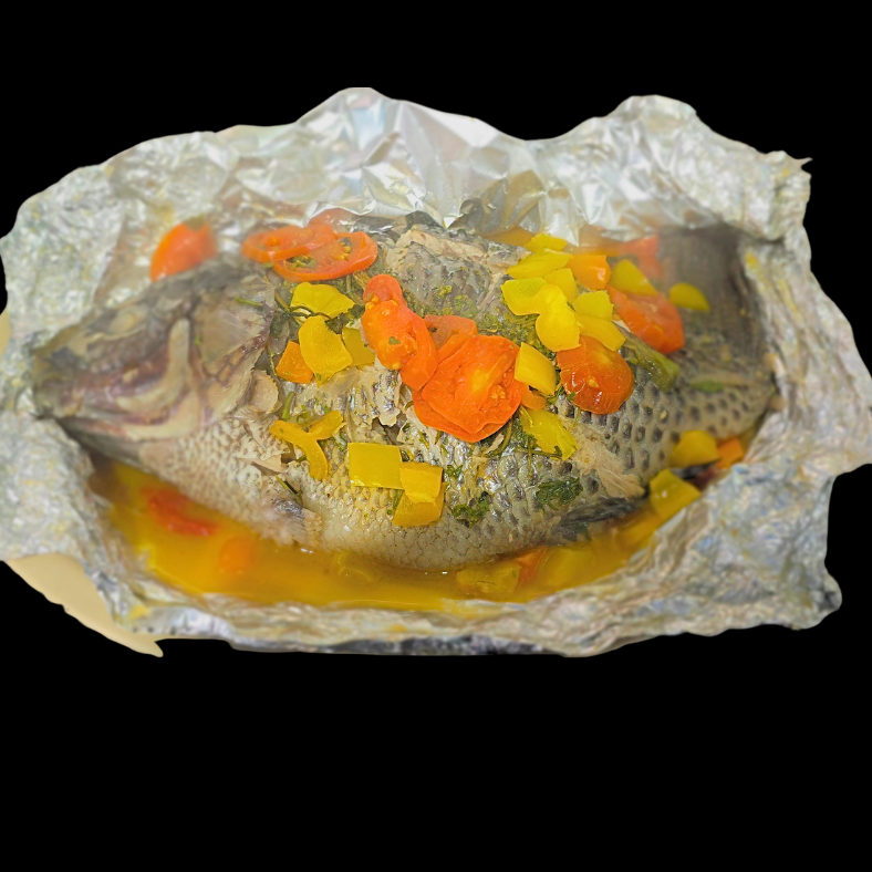 sabrosa mojarra de aprox. 1kg, cocinada en papel aluminio, con jitomate, cebolla, epazote y especies
