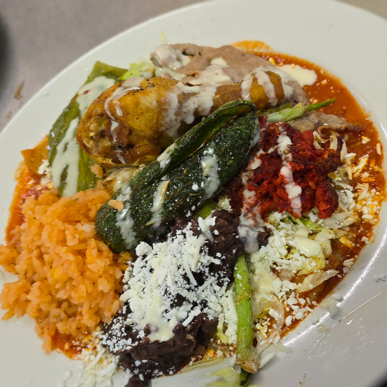 Bistek, cebolla de cambray, nopal, chile toreado, chorizo, pollo y enchiladas