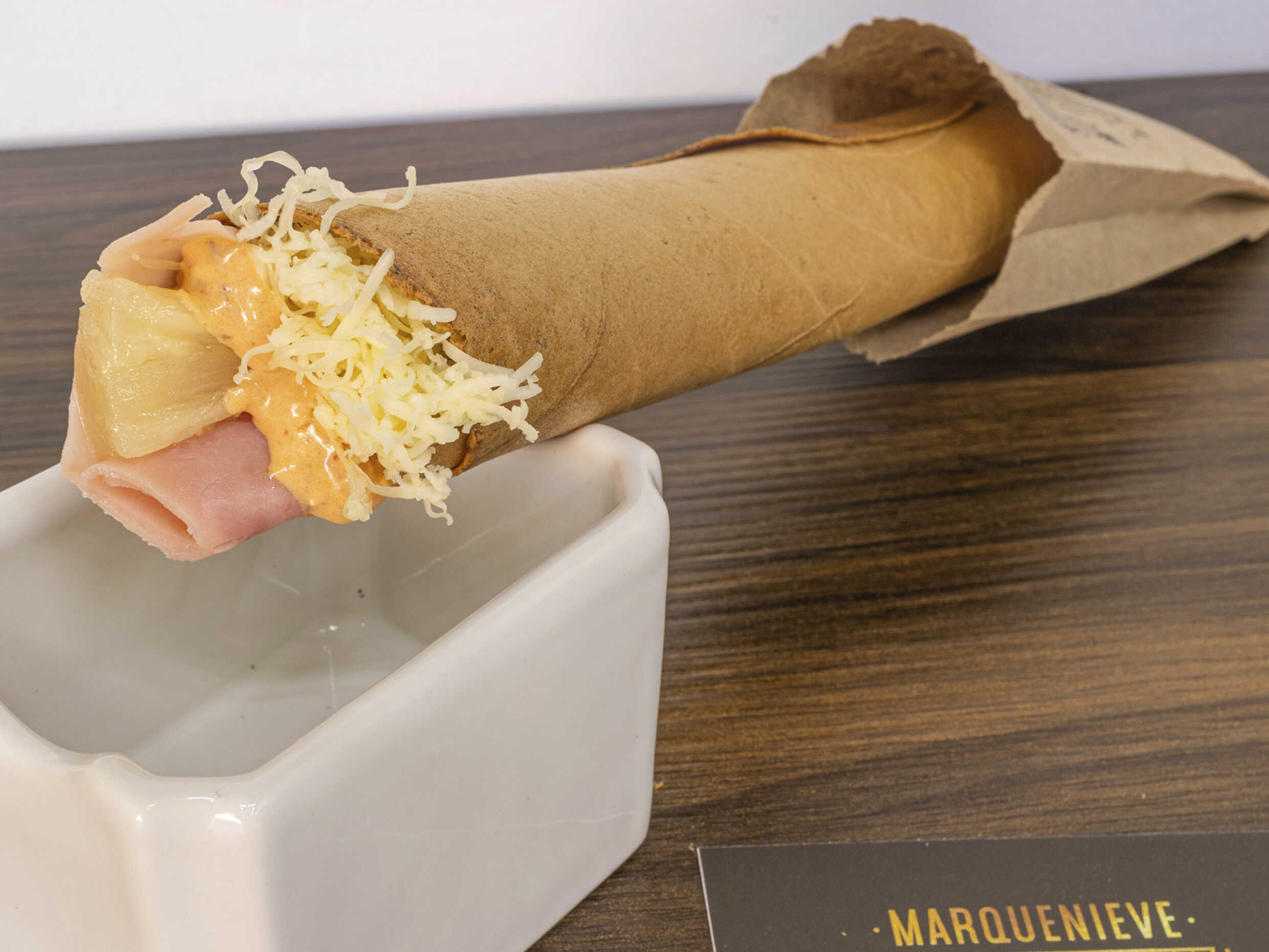 Queso bola, mermelada de chabacano, chipotle, jamón y pechuga de pavo.