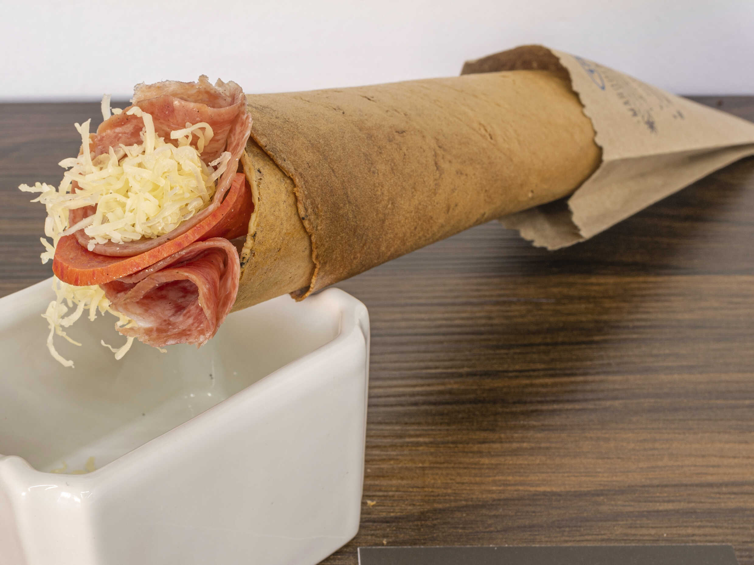 Queso bola, jamón, peperoni y aderezo de la casa.