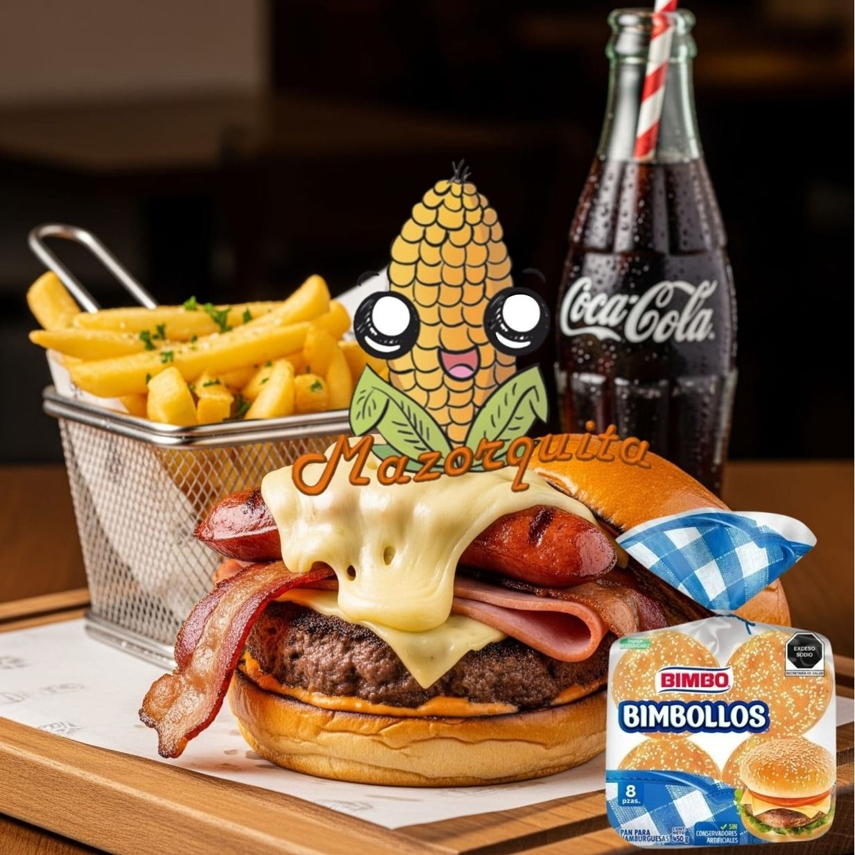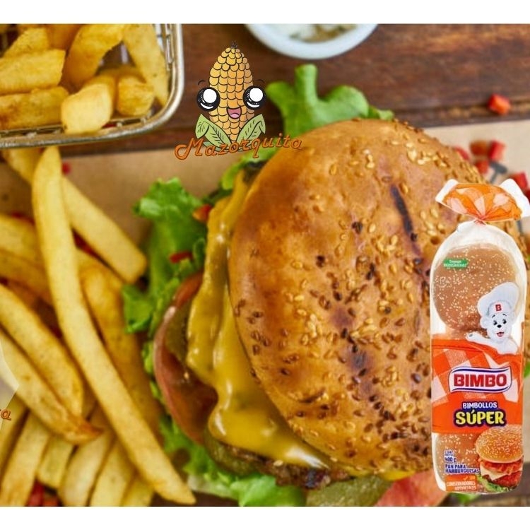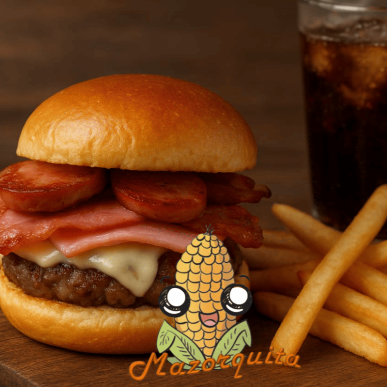 Hamburguesa con carne de res con tocino, salchicha, jamon, queso de ebra, queso amarillo, jitomate, lechuga, jalapeños, catsup, mostaza, mayonesa: acompañada de papas a la francesa 200grs