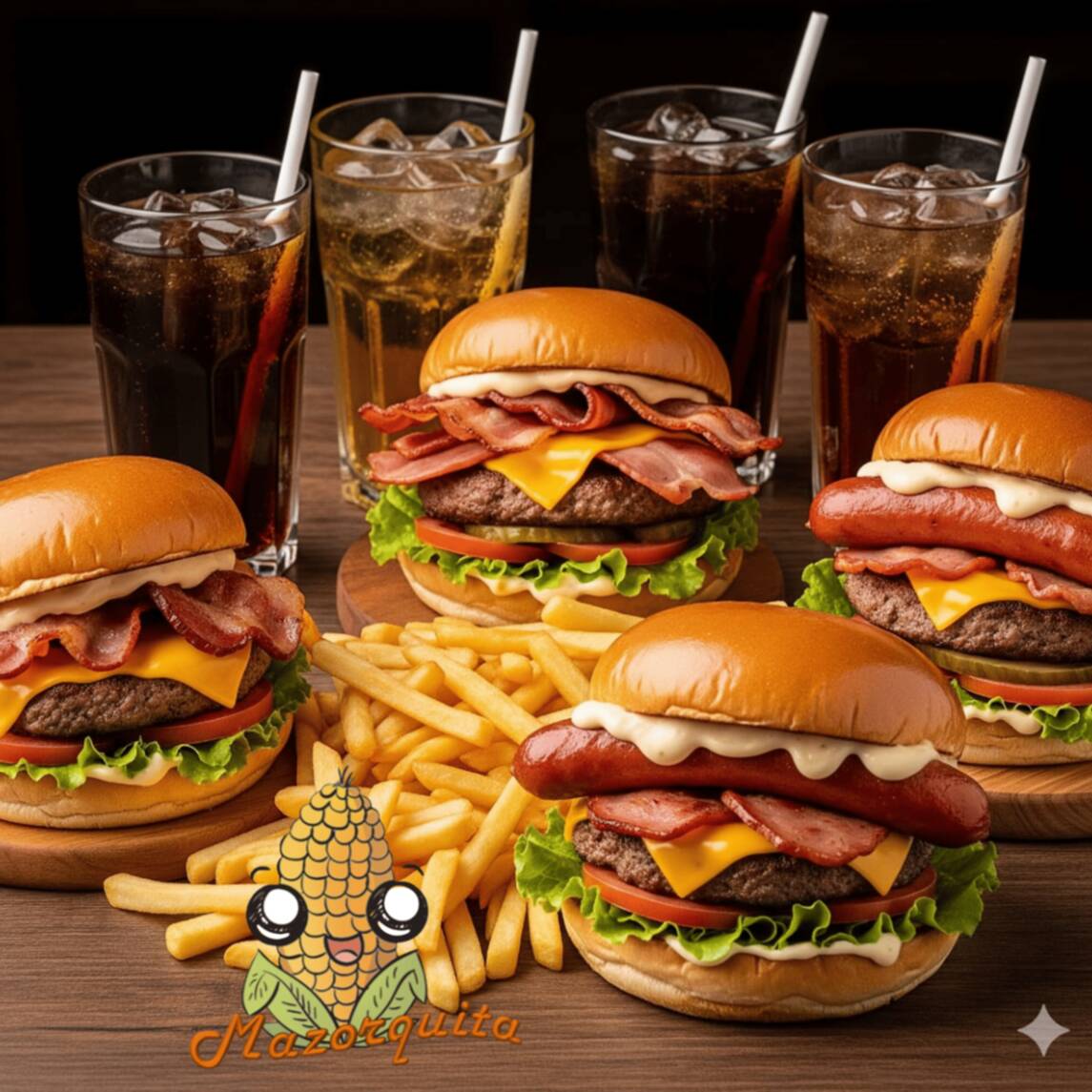 4 Hamburguesas más 4 papas y 1 refresco 2 lt.