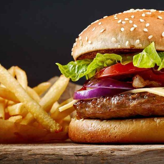 Hamburguesa de carne acompañada de papas a la francesa