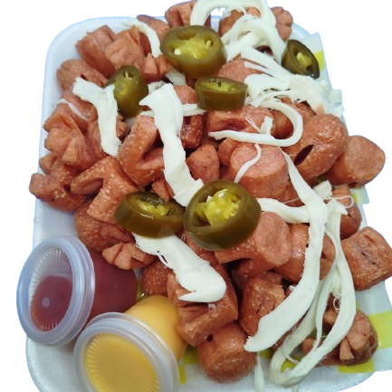 Papas a la francesa con salchichas catsup y queso amarillo, chiles jalapeños.