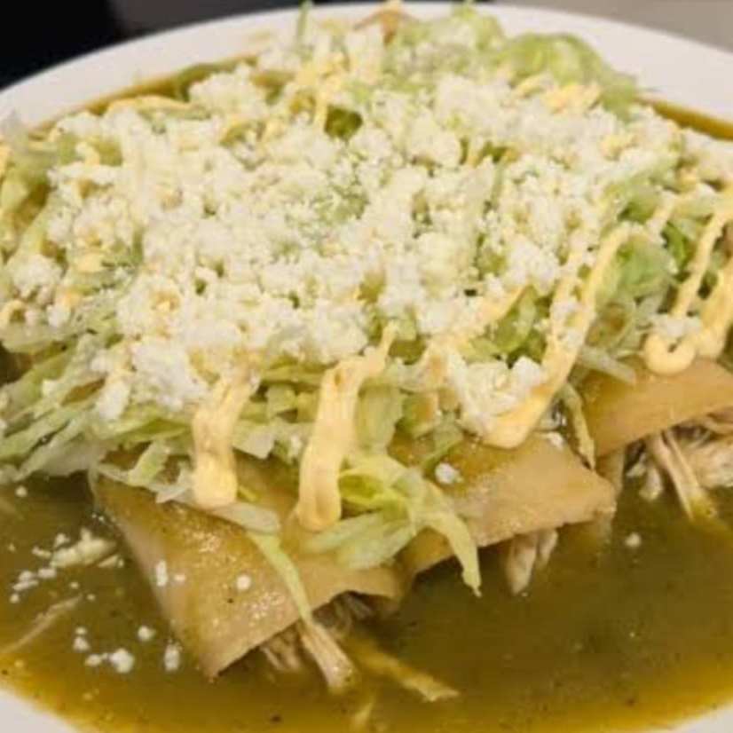 tortillas de maíz rellenas, típicamente de pollo deshebrado, cubiertas con una salsa verde hecha a base de tomatillos, chiles, cebolla y cilantro acompañados de arroz y frijoles refritos sazonados.
