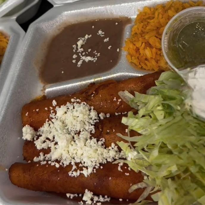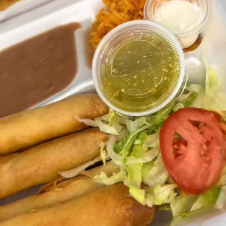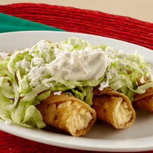 tortillas de maíz rellenas de pollo deshebrado, enrolladas y fritas hasta que estén doradas acompañados de arroz y frijoles refritos sazonados.