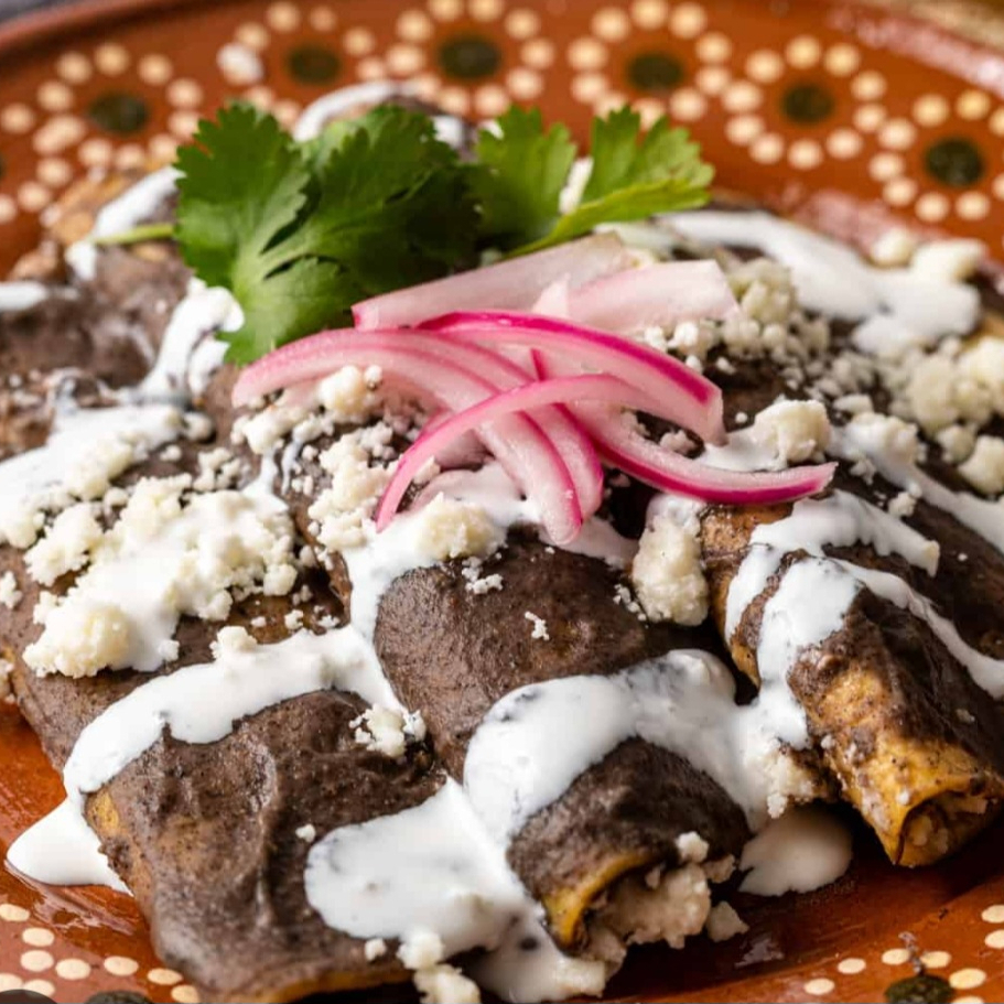 tortillas de maíz bañadas en un adobo rojo a base de chiles secos, rellenas de pollo deshebrado y acompañadas con arroz y frijoles refritos sazonados.