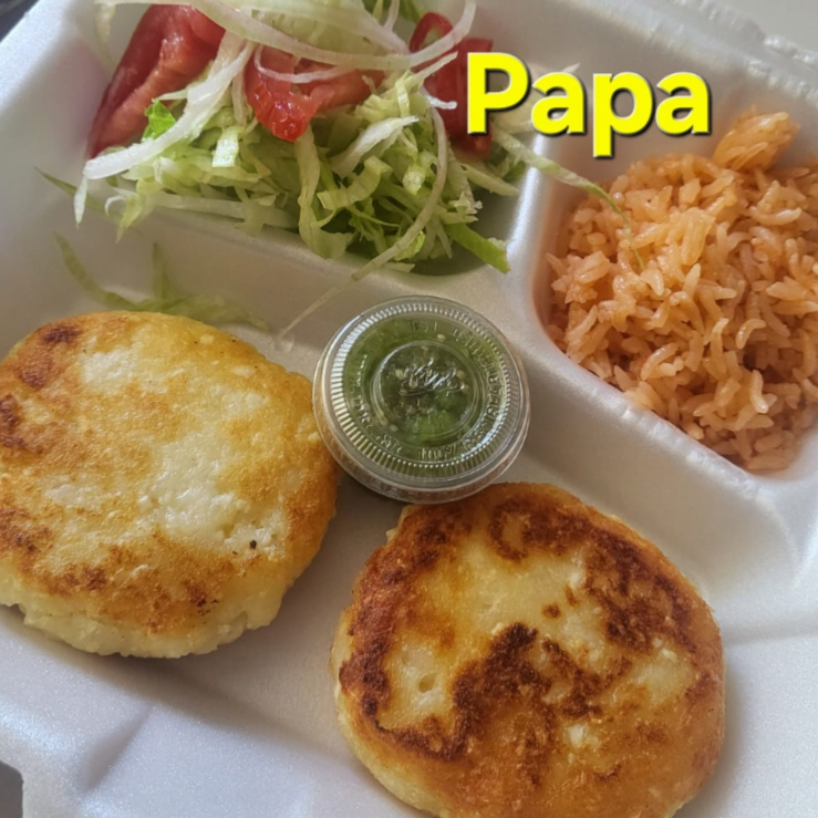 papa cocida y machacada con otros ingredientes como huevo, queso o pan molido acompañado de arroz y frijoles refritos sazonados.