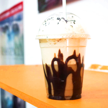 Doble shot de espresso, leche, chocolate líquido y hielo frappeado, en vaso de 355 ml.