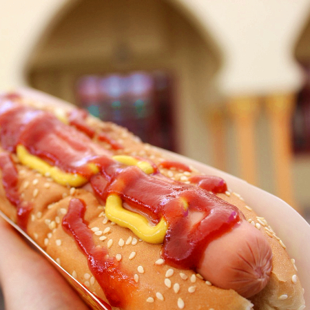 Salchicha jumbo en pan brioche, con catsup y mostaza