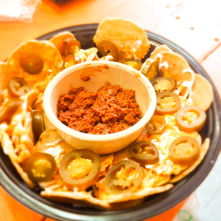 Totopos de maíz bañados con crema y queso amarillo, con rodajas de jalapeño y nuestra receta de chilli casero, con carne de res, chorizo y chiles