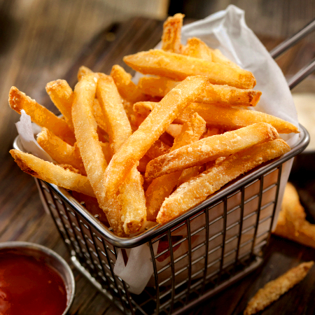 Papas en corte recto, fritas en aceite y aderezadas con sal